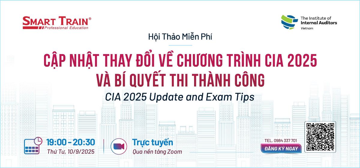Nhằm hỗ trợ Anh/Chị cập nhật kịp thời những thay đổi của chương trình CIA 2025 và trang bị bí quyết ôn thi hiệu quả, Smart Train Academy phối hợp cùng IIA Việt Nam trân trọng kính mời Anh/Chị tham dự hội thảo với thông tin cụ thể như sau: