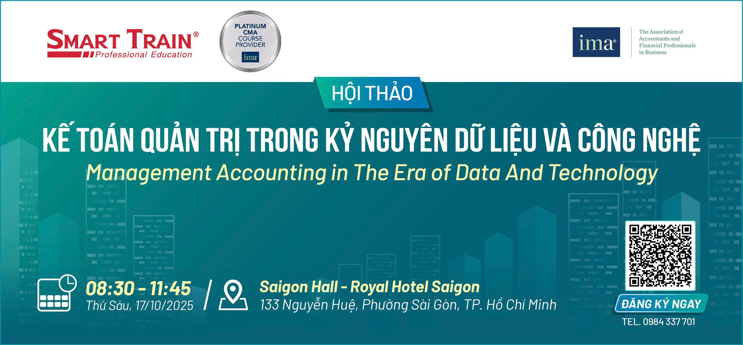 Thân mời Anh/Chị tham gia buổi hội thảo do Smart Train Academy – Đối tác đào tạo CMA đạt chuẩn chất lượng BẠCH KIM (Platinum CMA Course Provider), phối hợp cùng Hiệp hội Kế toán Quản trị Hoa Kỳ IMA đồng tổ chức với thông tin chi tiết như sau: